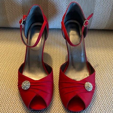 Lekre og kule 90 talls sko i ravnsort silkemateriale. Sitter veldig flott på foten og er stødige å gå med. Hælhøyden er 9 cm målt på yttersiden og 6,5 cm målt på innsiden. Silkestoffet er helt uten rifter og slitasje, glidelås inntakt og kun synlig brukt under sålen men ikke mye.