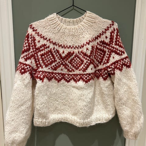 Ny og ubrukt Chunky Marius i hvit med rødt mønster fra Sandnes Garn . Jeg synes den er litt liten i str. Strikket med dobbel tråd, kos og børstet alpakka.