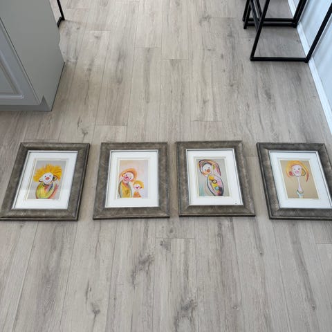 To stk klovnebildet. To like store bilder. Ytterkant ramme: 81 x 46 cm. Som nye, uten en ripe. 400,- pr. stk eller begge samlet pris 600 kr