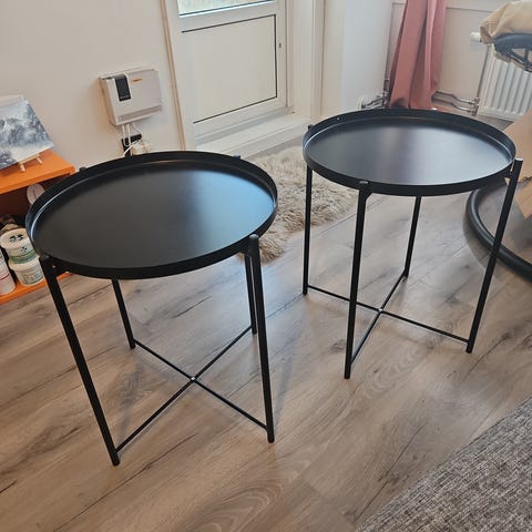 2stk sidebord med løse brett på toppen. Som nye. Selges kr250pr stk Eller 400,- for begge