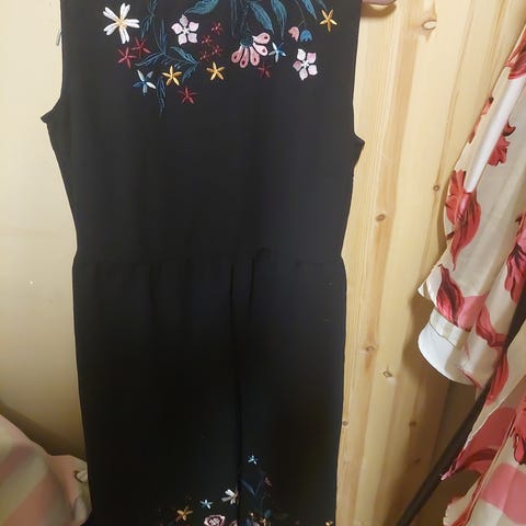 Svart kort innsvingt kjole med fargerike broderier selges. Kjolen har et klassisk snitt og en flatterende passform med stramt liv og utsvingt skjørt med stor vidde.
