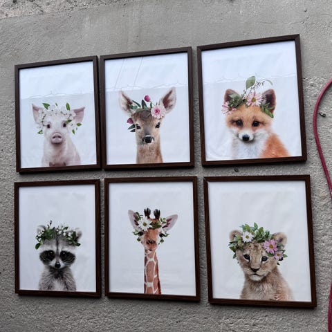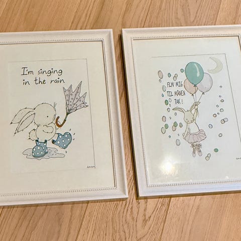 Bilder 33*43 cm, brukt kun til styling av barnerom, fra Desenio (ramme IKEAs RIBBA). Den ene rammen har en liten produksjonsskade, se bilde. Selges samlet til 400kr evt 150kr/stk, den med skade for 100kr.