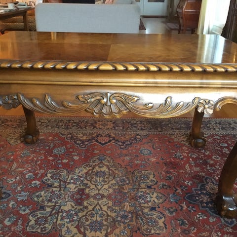Gammelt salongbord med flotte detaljer i understell - solid håndverk. Noen bruksspor i bordplate.