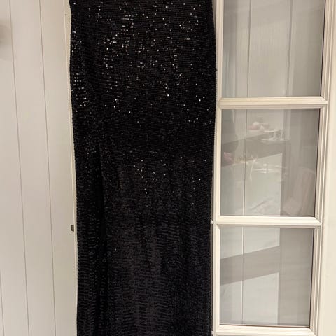 Nydelig ettersittende paljettkjole med stretch. Ankellang og høyt liv. Sitter perfekt på. Splitt foran til under kneet. Stropper som henger ned over skulderen. Usynlig glidelås i ryggen. Fra kjolemeeket Eva Sandi. Helt ubrukt grunnet feil størrelse.