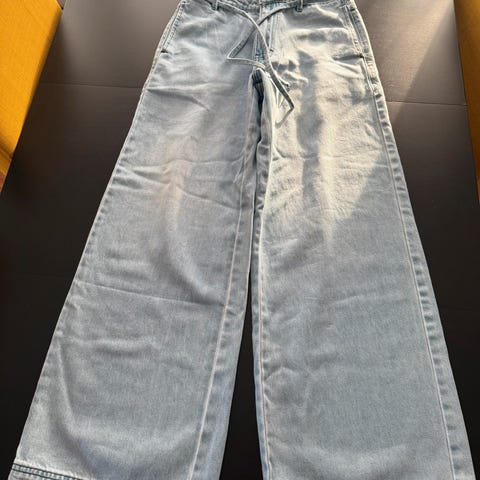 Kule jeans med høyt liv, smal over rumpe og hofter og vide ben. Lysblå vask.
