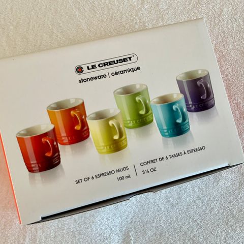 Attraktiv gaveeske med 6 espressokrus(100 ml) i regnbuens farger. De 6 espressokrusene har den perfekte størrelsen til en kopp espresso eller cortado, og det glaserte steintøyet har gode varmeegenskaper, og holder derfor kaffen din varm i lengre tid. En opplagt gaveidé til kaffeelskeren.