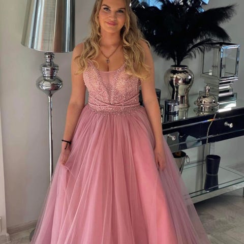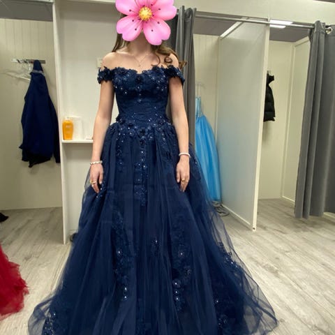 Leier ut denne nydelige mørkeblå Alexandra Ritzi ballkjolen. Den er kjøpt i desember 2024. Kjolen er i størrelse 36, og er justerbar med knytting på ryggen (Passer str S til M). Kjolen kan passe alle rundt 165 avhengig av sko. Jenta på bildet er 165 og hadde 2cm sko.