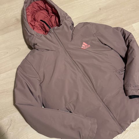 Stilig dunjakke fra Adidas. Nydelig burgunderfarge. Tykk og god. 60% andedun/40% fjær. Som ny! Veldig pent brukt. Lommer med fleece og trykknapp. Snøring nede hvis du ønsker å stramme den inn nede. Kraftig og god glidelås. Nypris 1900.-