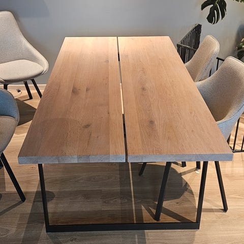 Vakkert spisebord i hvitpigmentert, HELTRE eik (både ben og bordplate) fra Bolia. Kjøpt i 2021, men har kun vært i bruk i 2 år. Det måler 220, men kan bli 270 med ileggsplate (allerede solgt)