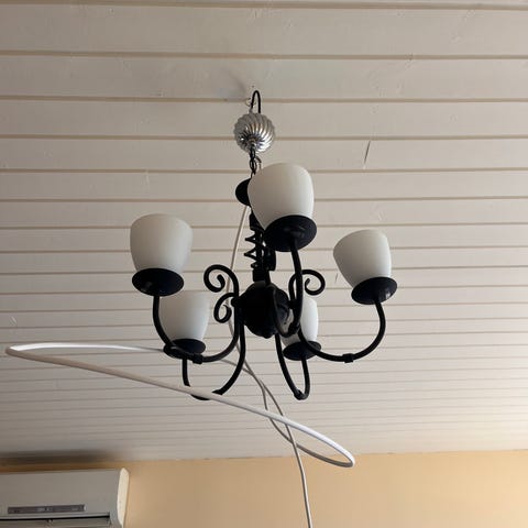 Lysekrone i smijern. 6 stearinlys. Lengden kan justeres. Fargen er mørk grå / sølv.