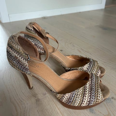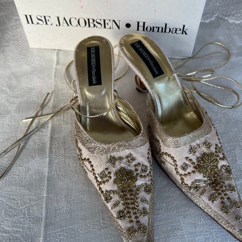 Arabiskinspirert gullsko med ankelsnøring i gullrem. Spiss i front. Stiletthæl. Knapt brukt.