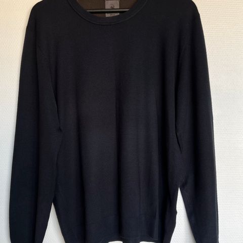 God og varm ullgenser i 100% merinoull, mørkeblå. Er nuppete foran ved sidene på magen, se bilder. Derfor selges den meget billig.