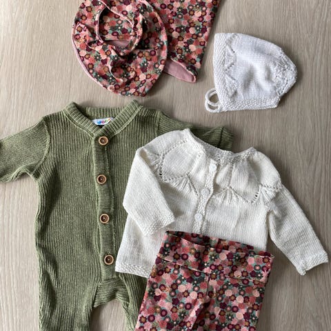 Strikket cardigan i bomull og 2 bukser. Cardiganen er brukt en gang og buksene er ubrukte.
