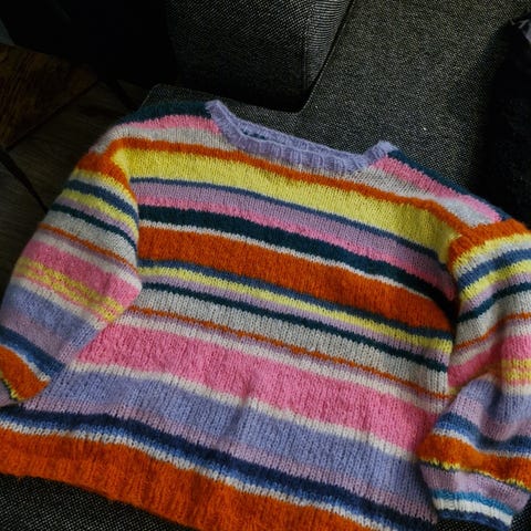 Nydelig Strikket lang genser Regnbuens farger i KidMohair garn fra «Strikkemekka»