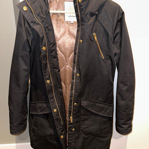 Sort dunjakke fra Fleischer Couture. Størrelse 34. Modell: Bellatrix. Dette er en god og varm jakke med vannavvisende stoff. Kjøpt for noen år siden, men lite brukt og fremdeles i fin stand. Ingen skader, bortsett fra at "håndtaket" på glidelåsen foran mangler den lille skinndetaljen med logo. Denne har dessverre falt av, men glidelåsen fungerer fint og dette har ingen praktisk betydning. Se bilder for detaljer. De to siste lånte bildene viser hvordan jakken var med skinndetaljen på glidelåsen.