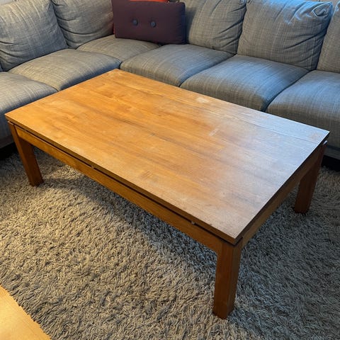 Sofabord selges billig. Generelt en del bruksmerker, men mye bruk igjen. Lys flekk som er forårsaket av varme, men som sikkert kan fikses med Liberon ringfjerner.