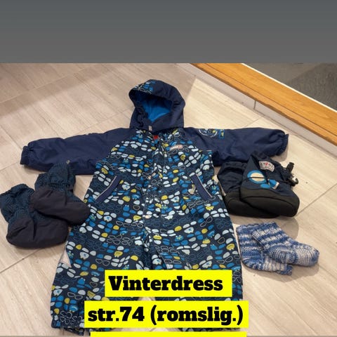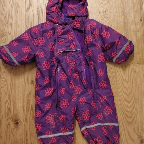 En varm og god vinterdress i størrelse 74. Praktisk med åpning i begge sider. Gode strikker til føttene og avtakbar hette.