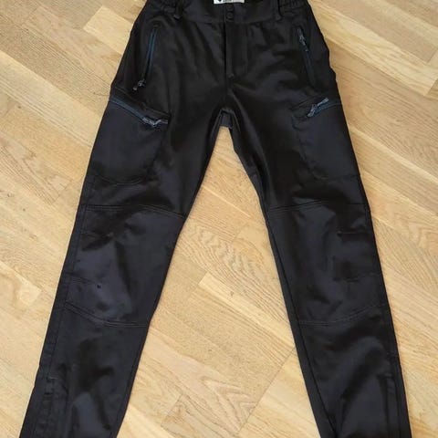 Sort foret utebukse/overtrekksbukse. Buksa er godt brukt, men alle glidelåser til lommer, front og nede på beina er helt fine. Buksa har også regulering i siden med stropper og borrelås for å stramme i livet. Buksa har også innvendig "gamasjer" med strikker i begge bein nederst for å unngå snø inn. Disse er helt fine. Buksa er litt slitt og derfor lappet på kneet. I tillegg er det slitasje i det ytre laget nederst på beina som er reparert. Se bilder. Utebukse med mye bruk igjen.