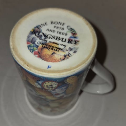 Meget pent engelsk krus/ kopp fra Kingsbury. Diameter ca 73 mm, høyde ca 105 mm. Ubetydelig bruksslitasje.