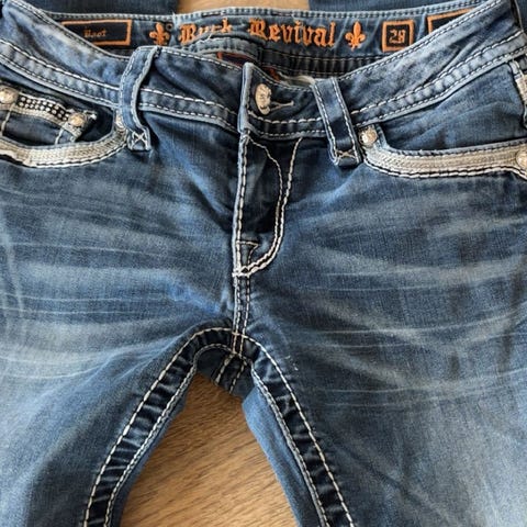 Det er skinny jeans som kan minnes om straight, og er 74 cm fra skrittet og ned.