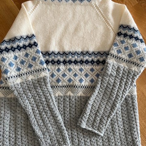 Hjemmestrikket, etter Sjømann-mønster fra Sandnes garn. Strikket i ullgarn.
