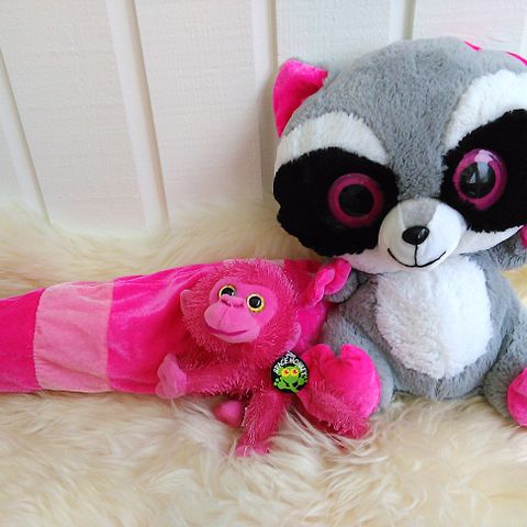 Kosedyr: Gullende ren, stooor rosa vaskebjørn med lappen på.