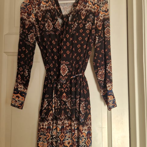Kjole i viscose med paisley mønster. Strikk i hals, livet og på ermene. Midi lengde, ca 123cm fra skulder og ned. Normal i str, S, tilsvarer 36/38
