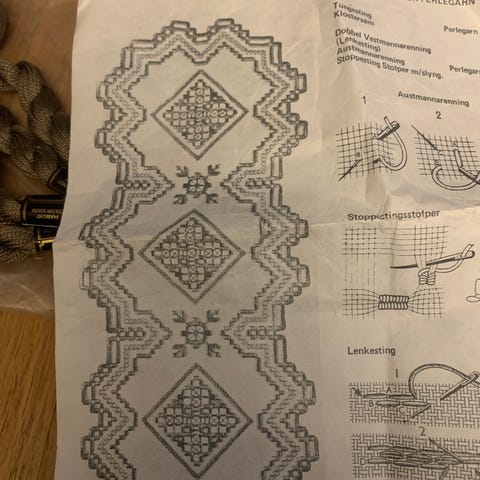 Pakke med nydelig hardangersøm løper, ferdimål ca 25x92 cm, og brikke ferdigmål ca 25x25 cm