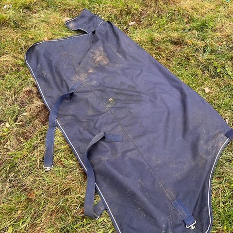 2. Horze Avalanche regndekken med fleecefôr, haleflappen hadde løsnet, men har sydd den på igjen med maskin. Ellers ingen skader. 300kr