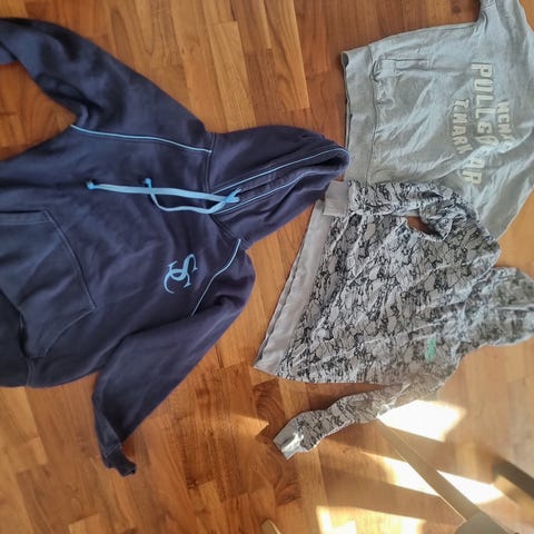 5 hoodies og en joggedress (Nike bukse str S og jakke str XS). Klærne er brukt men har ingen hull. Selges helst samlet, men kan selge separat om ønskelig. 50krr pr plagg eller 250kr samlet