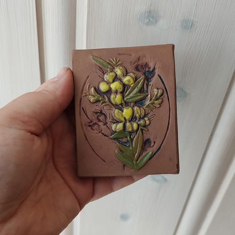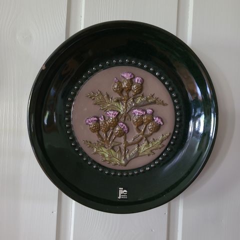 Fint vintage bilde i keramikk fra den svenske produsenten Jie. Litt dypere i fargene enn på hovedbildet, nærbildet er det som viser fargen best. I fin stand, litt krakelering i glasuren noen plasser. 23x18 cm.
