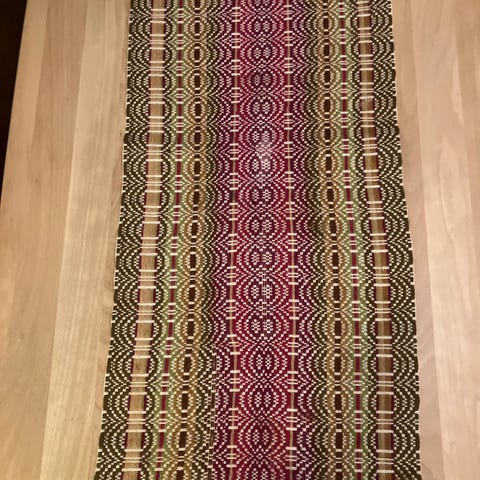Vakker løper i skilbragd i nydelige farger i nyanser av rosa, en farge i retning plommerød, lys grå og hvit. Det er min mor, Liv Rosenvinge, som har vevd løperen. Hun vevde aktivt på 1980- og 90-tallet. Løperen er ubrukt og har ligget sammenrullet i et skap i et røykfritt hus.