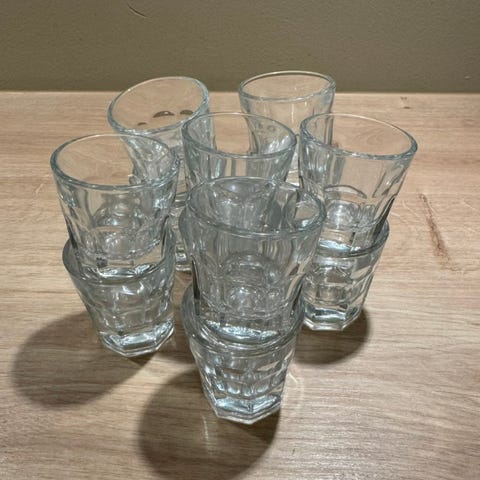 11 pent brukte drammeglass i pressglass .