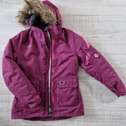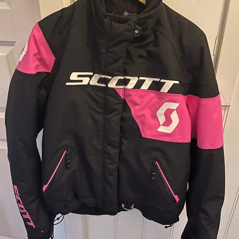 Fin jakke fra Scott, størrelse M. Brukt som snøscooterjakke, funker fint som vinterjakke også. Jakken har snøstopper rundt midjen og håndledd, hank til feste av dødmannssnor, avtagbar hette og mange lommer. Jakken har noen sorte merker på seg, ikke forsøkt fjernet, se bilder.
