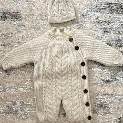 Selger en nydelig håndstrikket overall som kan passe babyer mellom 0-2 mnd🤍