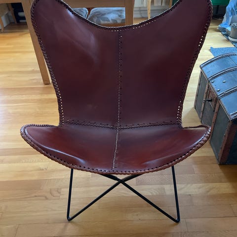 Lenestol med tilbakelent rygg, struktur i rørformet stål, polstring i fleksibel polyuretan, kald prosessert.