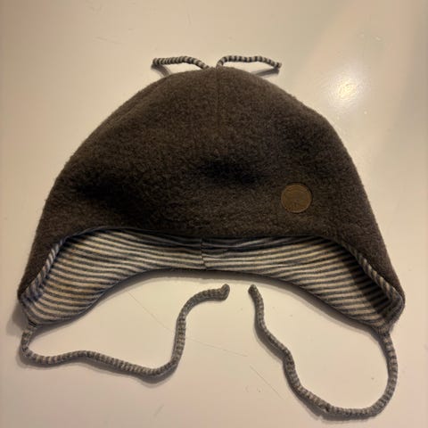Selger pent brukt ullfleece lue fra Nøstebarn. Farge sølvgran, størrelse 52 cm.