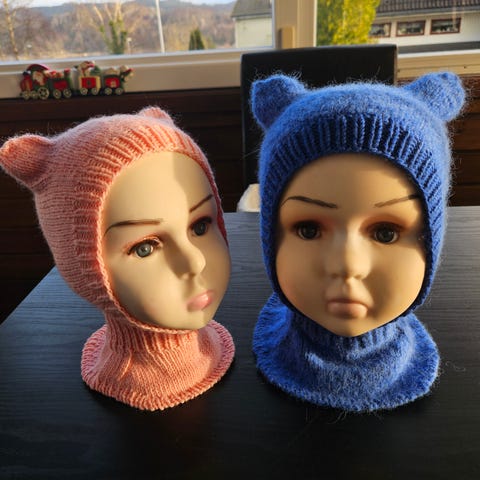 Str 6 mndr er på dukkemodellen og str 3 mndr ligger på bordet, den er også hetta på modellhodet.