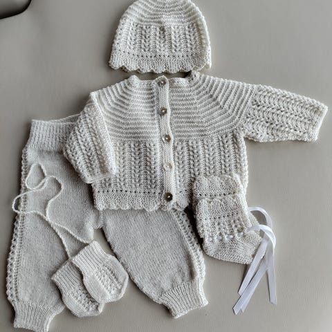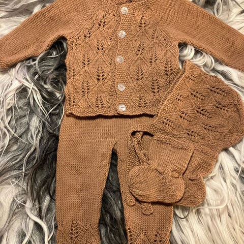 Nystrikket hentesett bestående av jakke, bukse, lue, sokker og votter.
