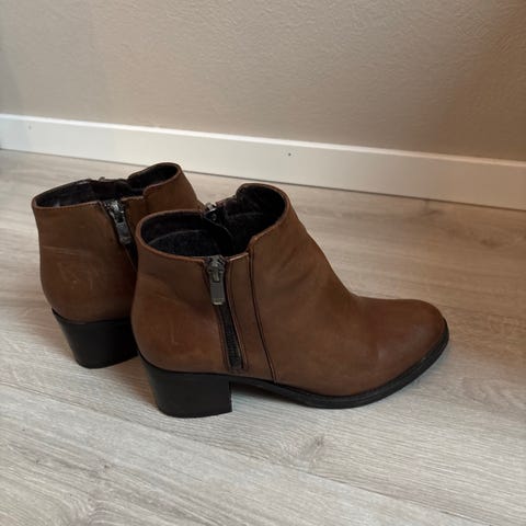 helt nye og kun brukt én gang. Fargen er brun, og de har et stilfullt design som passer perfekt til både hverdags og litt mer formelle anledninger. Kjøpt nylig, men de har ikke blitt brukt mye