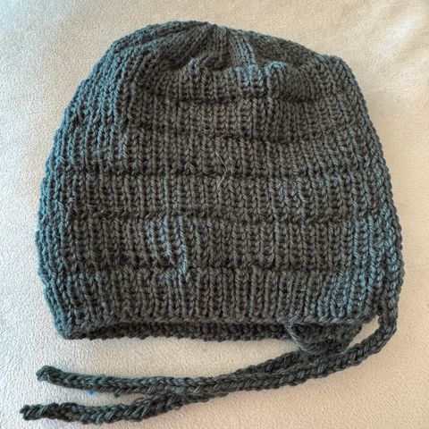 Selger en lue/kyse til baby. Den er strikket i størrelse 2–6 måneder. Den er strikket i fargen lyseblå. Den er aldri brukt.