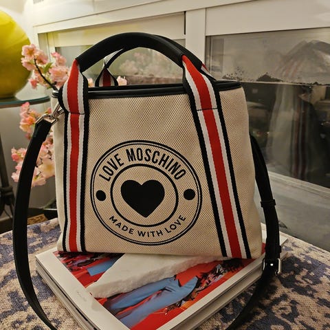 Moschino vesken kan ses/prøves/hentes sentralt på Jessheim, eller den kan sendes om kjøper dekker kostnaden ved frakt.
