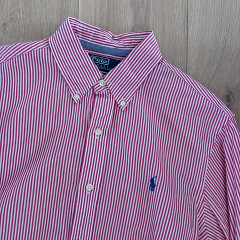 Skjorten er en L men jeg synes den tilsvarer mer en M, så har satt den som det. Det mangler en knapp på skjorten, hvordan det ser ut får du se på bildene jeg har lastet opp. Ellers er skjorten meget pent brukt og ingen andre tegn til slitasje.