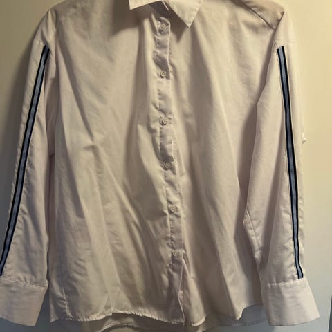 Nydelig lyseblå skjorte i merket GEOX selges. Det er hvite svake striper i stoffet, som er produsert i 70 % bomull og 30 % lin. Skjorten har flere søte detaljer, som snøring i livet og fint "hullmønster" foran.