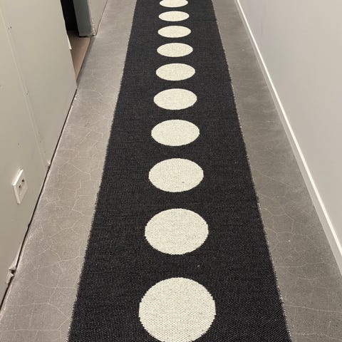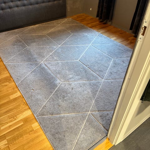 Pappelina gulvteppe brukt i inngangsparti. Teppet er i plast, så det er slitesterkt og lett å rengjøre.