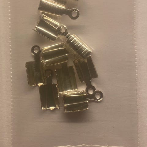 Klemmehylser, (båndavslutning) av sølvfarget metall. Sølvfargede. Bredde 20 mm. 10 par Med kjede og smykkelås karabin.