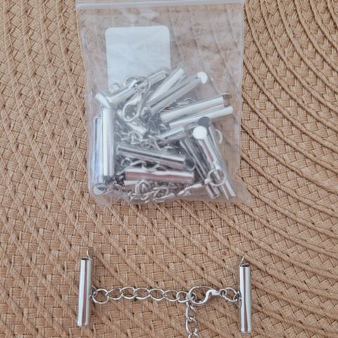 Klemmehylser, (båndavslutning) av sølvfarget metall. Sølvfargede. Bredde 20 mm. 10 par Med kjede og smykkelås karabin.