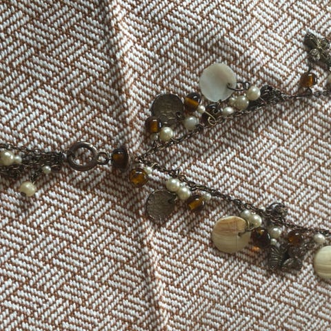 Laget av tre og regulerbart på lengden. Selges for 150kr. Øredobber selges for 50kr.