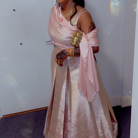 Brudekjole , fest kjole brukt kun en gang ,. Fargen heter champagne ser ut som lys rose farge , kan regulere på ryggen Den har knytting i rygg så det går an å justere... kan sende 38/40 størrelse, passer for 170 cm høyde