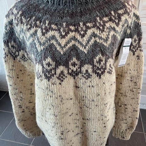 Tykk og varm ullgenser. Turkis med mønster. Overvidde 114 cm, lengde 66 cm